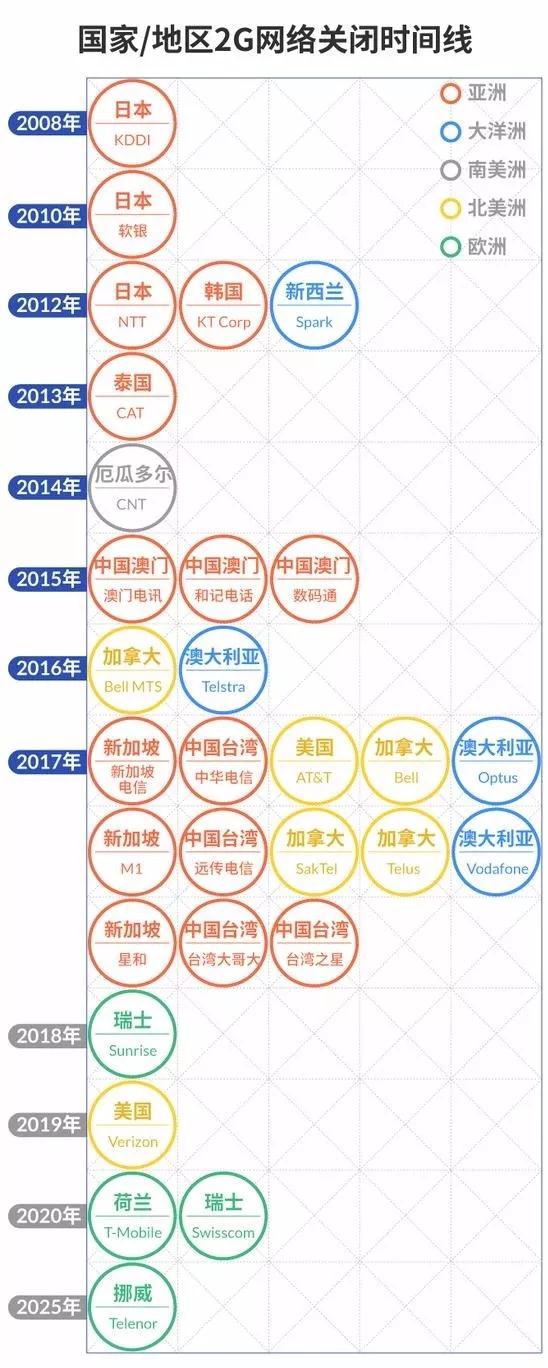 近年來,全球電信運(yùn)營商對2G/3G網(wǎng)絡(luò)退網(wǎng)動作頻頻。早在2008年,日本KDDI便已經(jīng)對2G進(jìn)行退網(wǎng);2016年,澳大利亞電信已經(jīng)進(jìn)行了2G退網(wǎng);Verizon(威瑞森電信)也將在2019年實(shí)現(xiàn)2G退網(wǎng)。